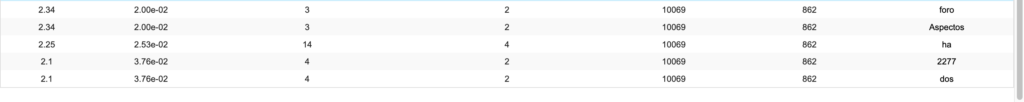 Esta imagen muestra la calificación, la probabilidad, frecuencia en el corpus, frecuencia en la partición, tamaño del corpus, tamaño de la partición y las palabras que resultaron con mayor frecuencia dentro de la búsqueda con las fuentes anteriormente mencionadas.